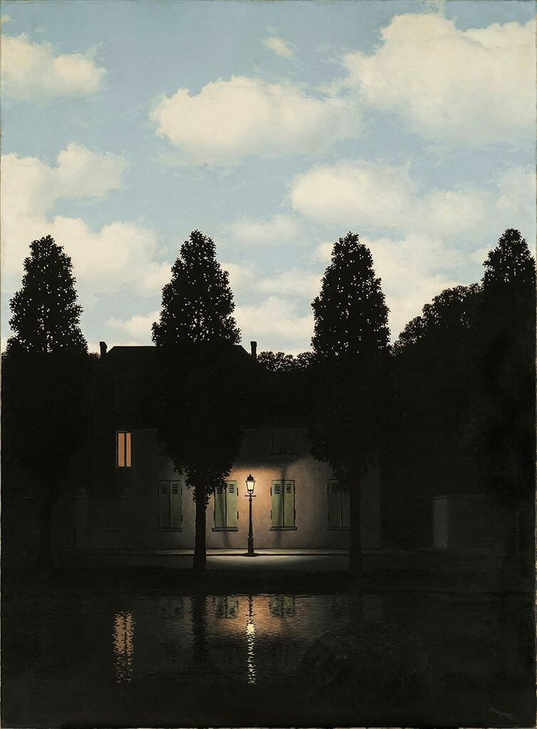 A house by the lake is illuminated by a single lamp deep into the night. Wait! Did I say night? No, I meant in broad daylight. Wait! No. Otherwise there would be no need for the lamp, which is clearly illuminating the house in the dark… Ahhh, Magritte, you did it again!