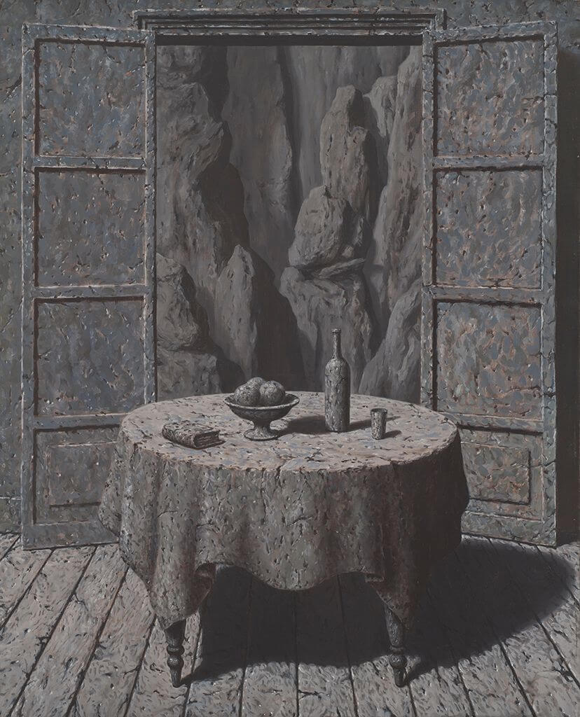A table, a bowl of fruit, a wine bottle, a glass and a book, along with the room that contains them, have all been petrified into stone. Through the opened windows/doors we can glimpse the outside cliffs, their rock appearing identical to the material making up the petrified objects.