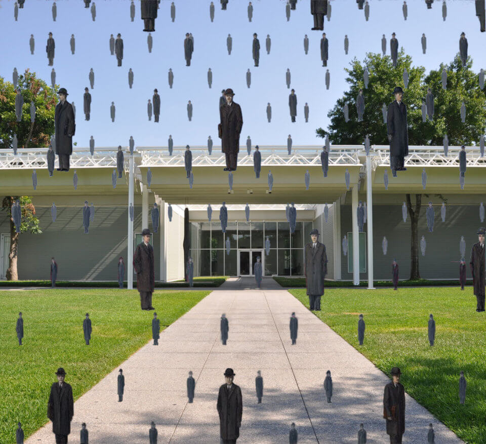 It’s raining men! Well, not quite. Golconda shows us several men dressed in overcoats and bowler hats floating in the sky, with red-roofed houses in the background that may be Brussels. The men look passively in different directions, seemingly unaffected by the fact that they are several meters above ground. The shadows on the buildings make it clear that these men are truly floating in the sky, without any hint of motion.