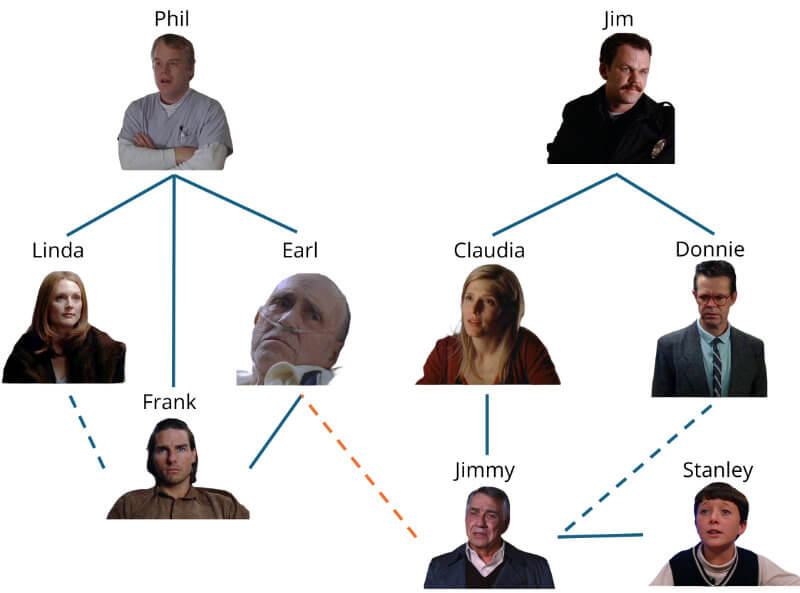 That is not to say that these connections couldn’t have been made more relevant and interesting (the movie Babel, in my opinion, does this exceptionally well, even though its characters are mostly from different countries). As shown in the figure above, there appear to be two clear clusters: one involving Frank, Linda, Earl and Phil (dashed lines represent known links although characters never directly meet in the movie). Another involving Jimmy, Claudia and Jim. Donnie and Stanley occupy more peripheral roles. The link between the two main clusters is relatively weak, connected only indirectly via Earl and Jimmy, the former being Jimmy’s TV boss (dashed orange line in the figure above).